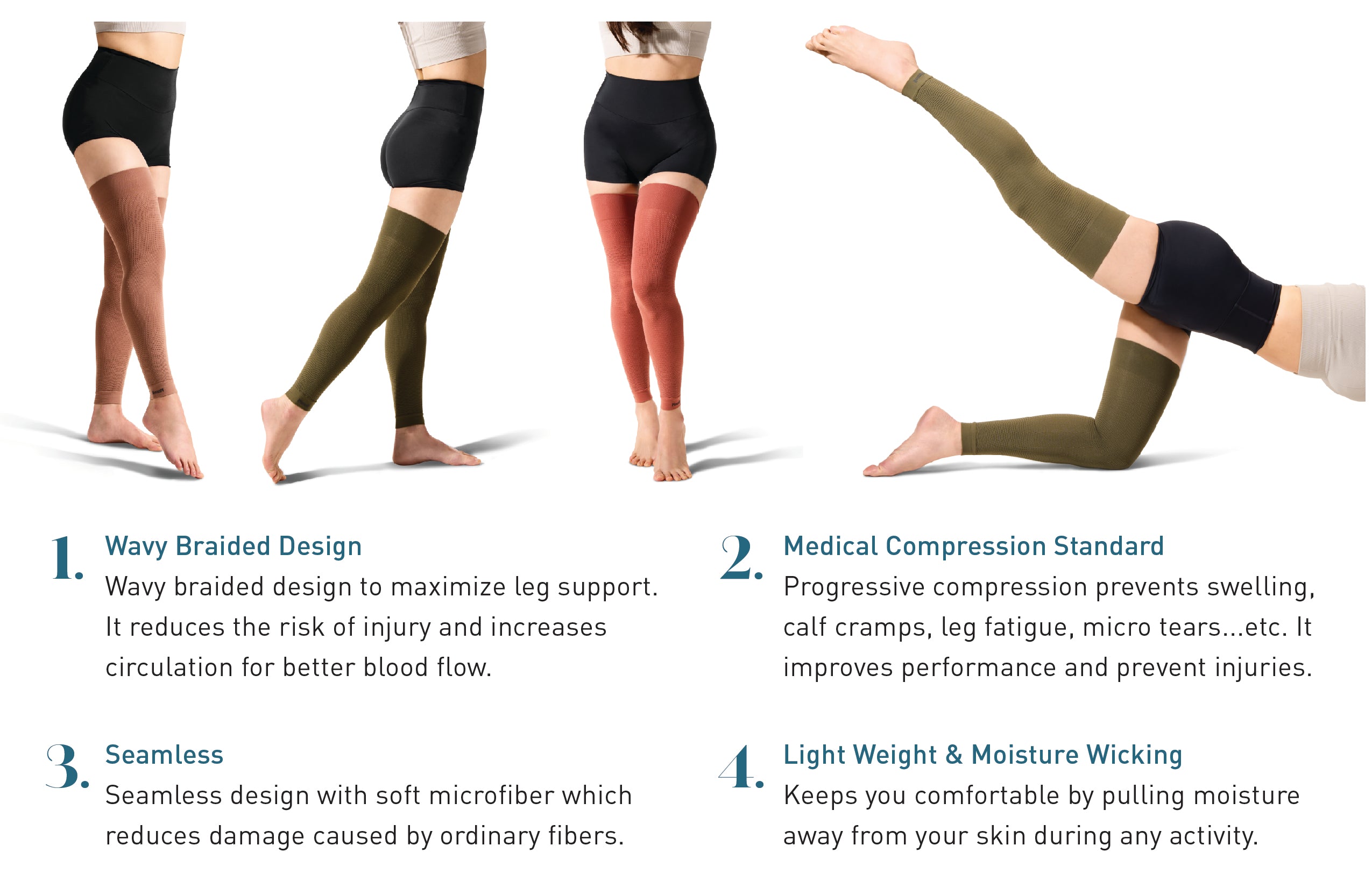 Wavy braided design to maximize leg support. It reduces the risk of injury and increases circulation for better blood flow.